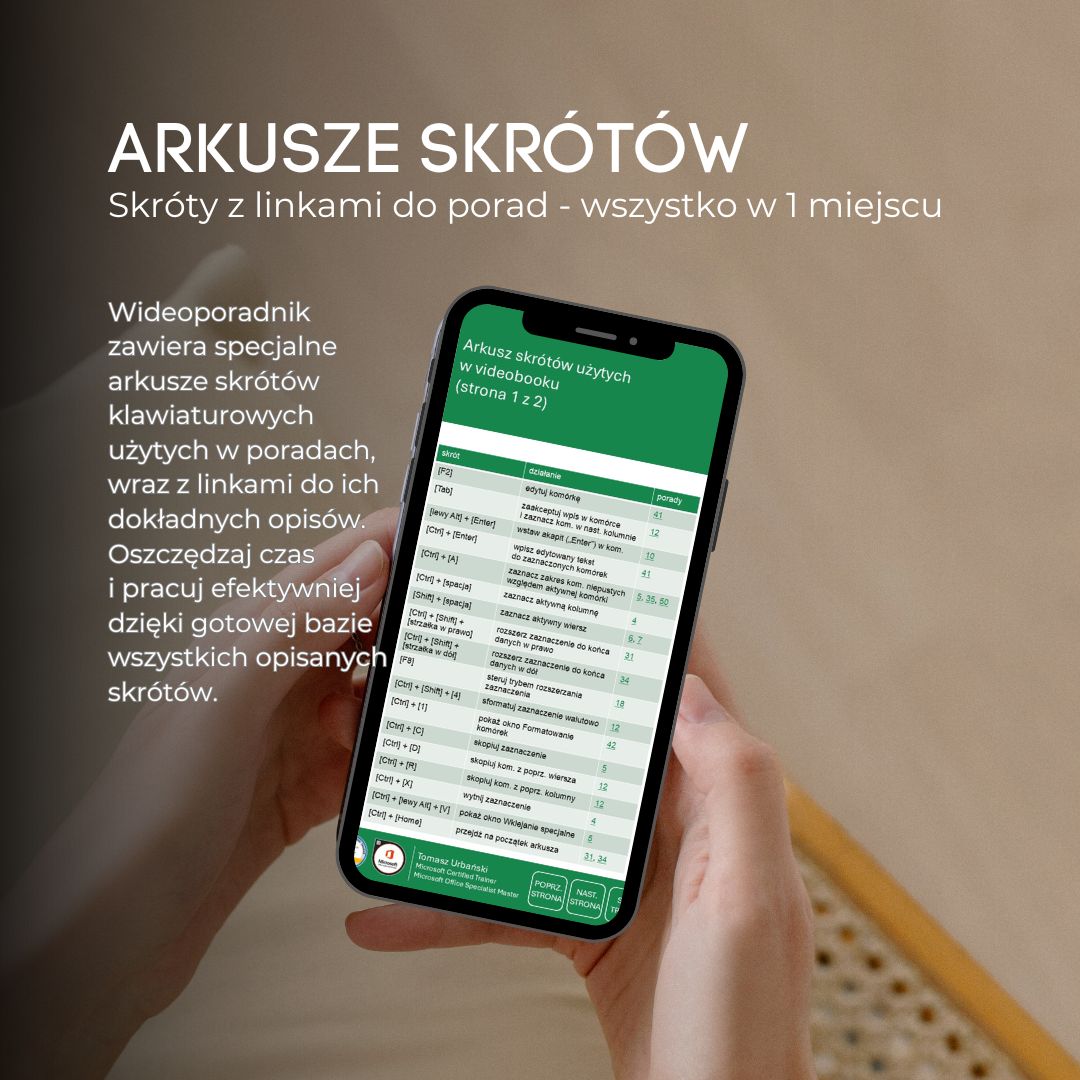 Wideoporadnik zawiera specjalne arkusze skrótów klawiaturowych użytych w poradach, wraz z linkami do ich dokładnych opisów. Oszczędzaj czas i pracuj efektywniej dzięki gotowej bazie wszystkich opisanych skrótów.